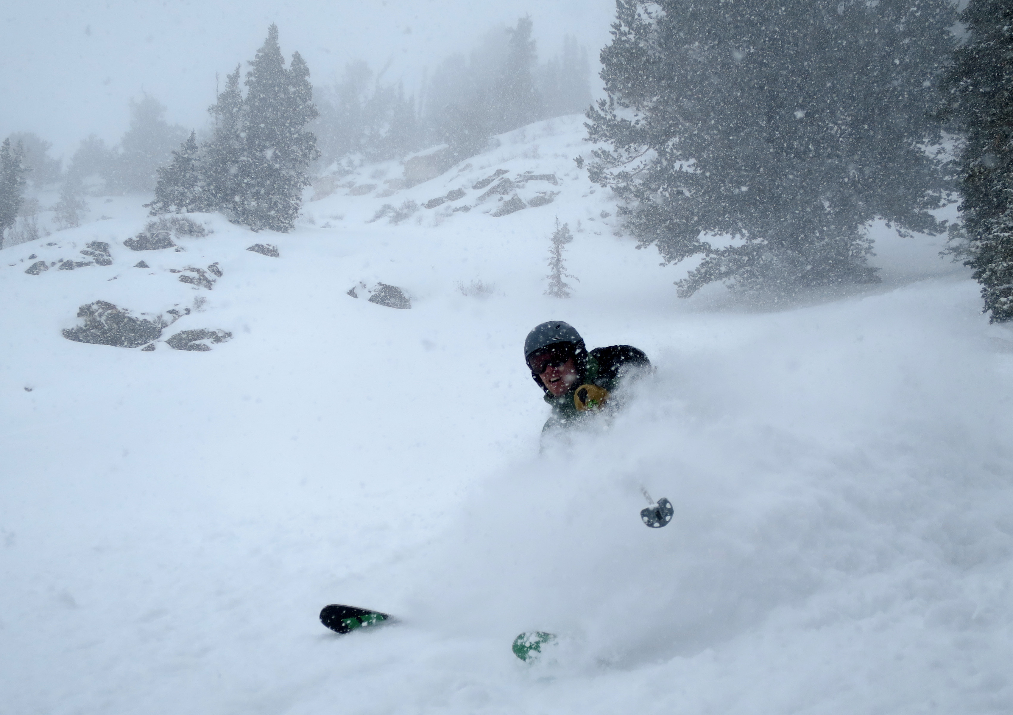 That evening Snowbird recieved some heavier, denser snow, and lots of wind, creating a windbuffed playground in favored areas the next day. We also got some great light to enjoy the surrounding views. Hannah racing down the windbuff near Little Cloud