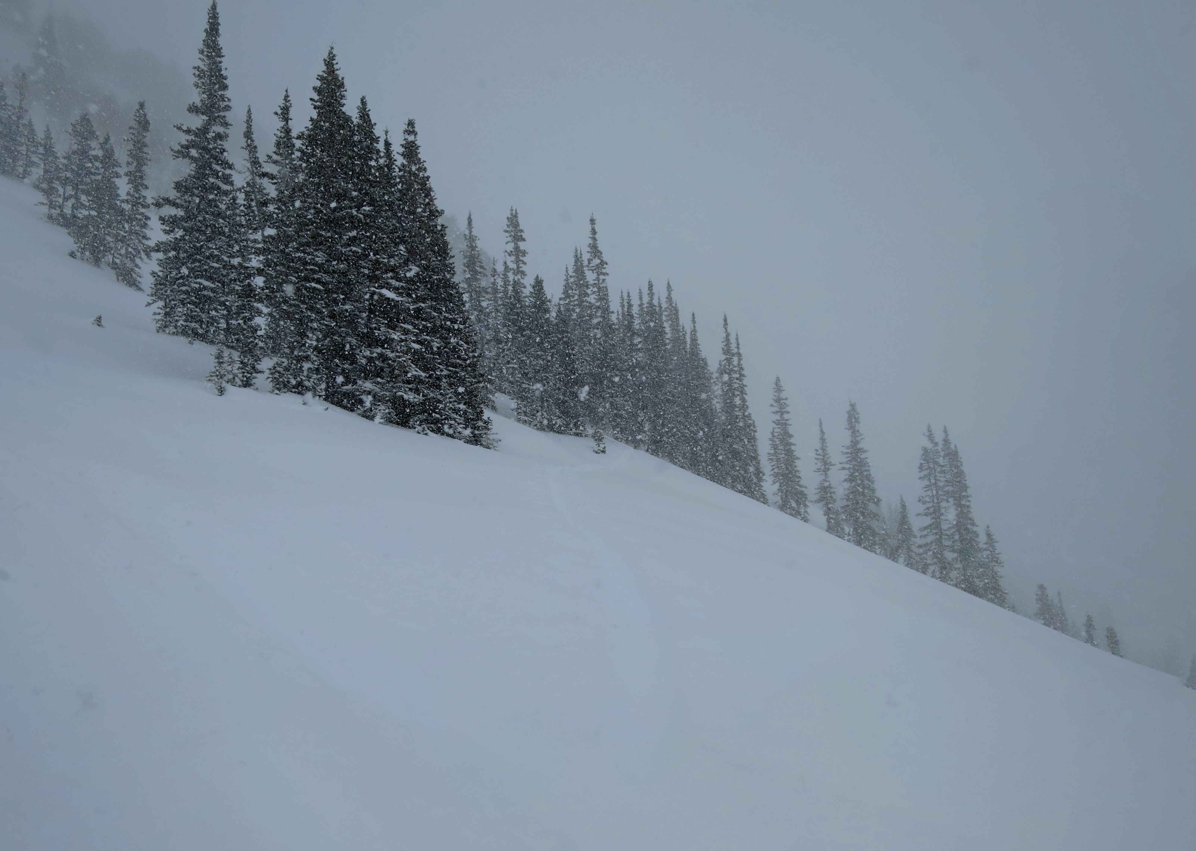 On Monday we set out for a tour in Grizzly Gulch. It snowed heavily all day, and the new snow was stacking up quickly. We skied right above the road and broke trail, pretty awesome given how close this zone is to the parking lot.